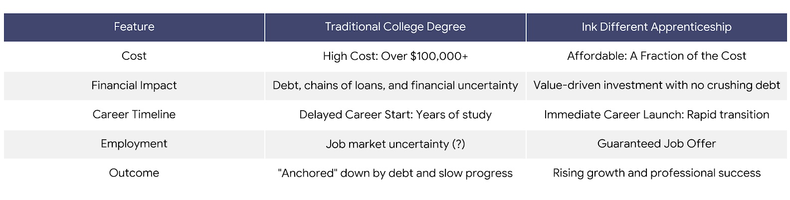 In contrast, our program is a fraction of the cost of a traditional college degree, with the added bonus of direct employment opportunities.