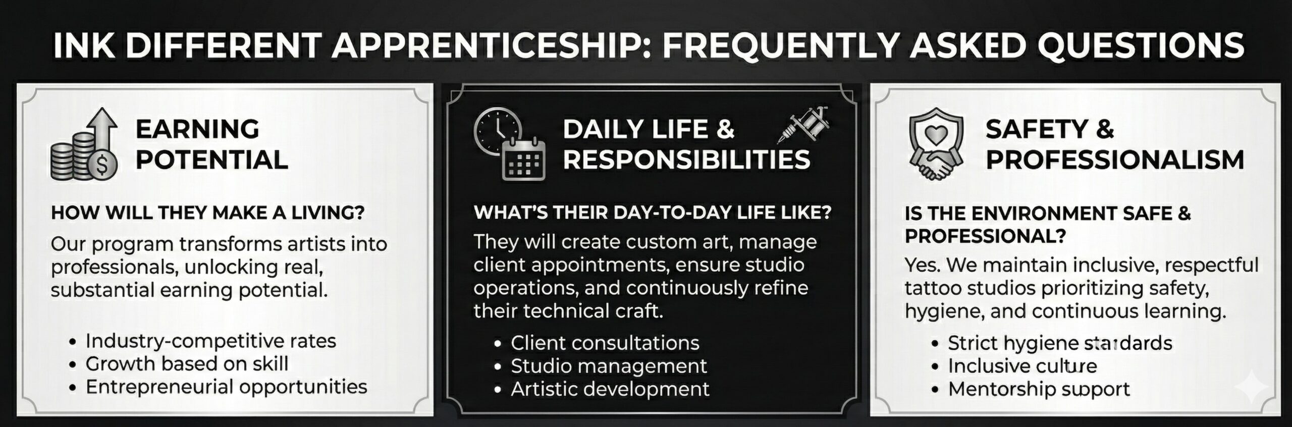 This program empowers future tattoo leaders to refine their craft, sharpen their brand, and confidently enter the next phase of their careers.
