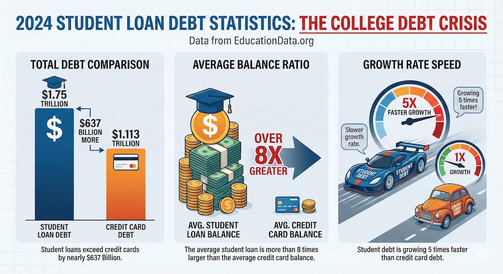 - The average federal student loan debt per borrower is 8.35 times higher than the average credit card debt per consumer.